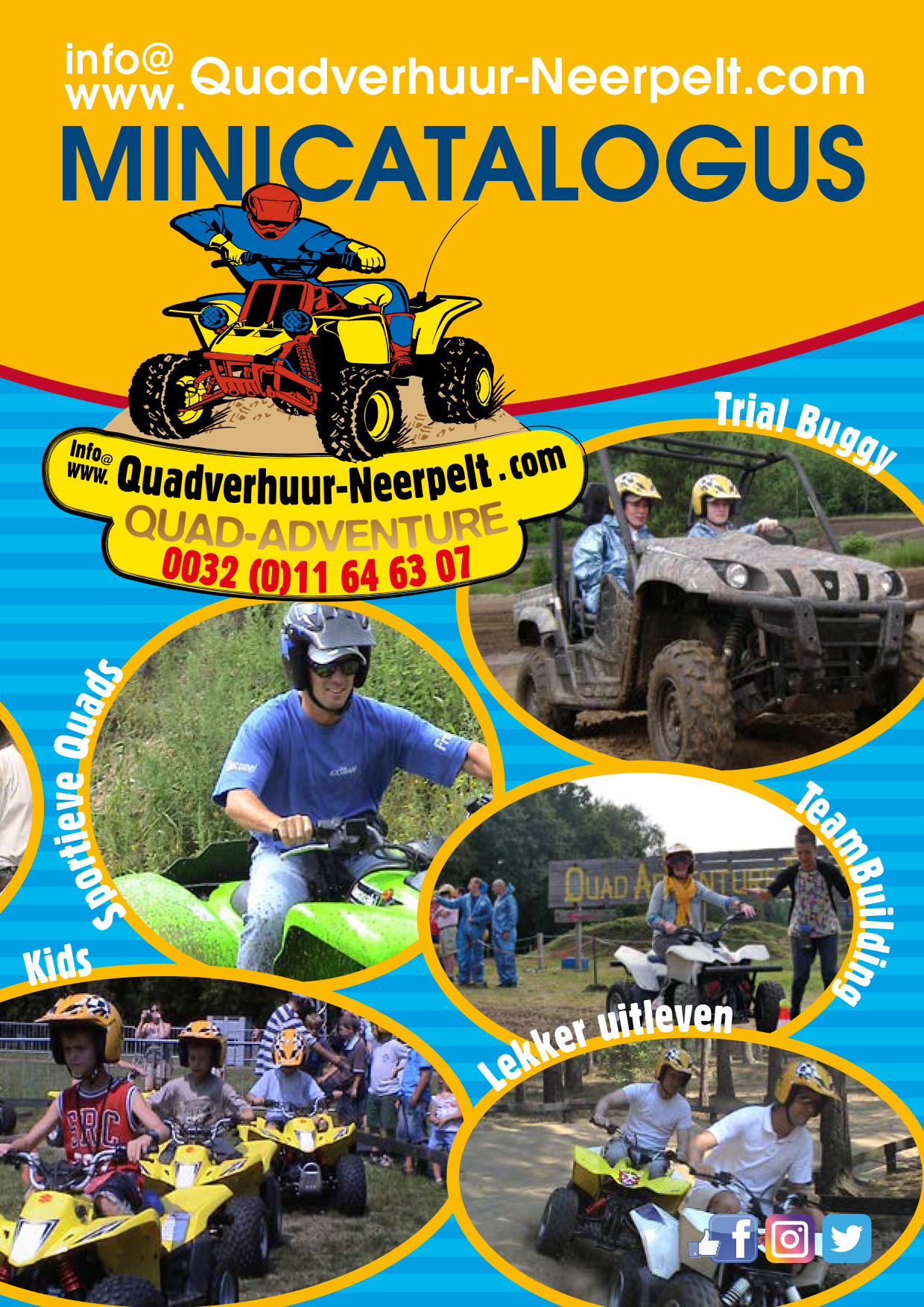 Quadrijden kan al vanaf € 11,-- pp en onze georganiseerde programma's voor kids al vanaf € 19,50 pp en voor volwassenen vanaf € 42,-- pp. Wenst u ons totaal aanbod vraag dan onze Minicatalogus. Wilt u gewoon even komen kijken of quadrijden voor uzelf en de kinderen, kijk dan even op onze Pay & Go pagina voor welke regio's, de openingstijden en kosten. Kijk hier onder naar de mogelijkheden.