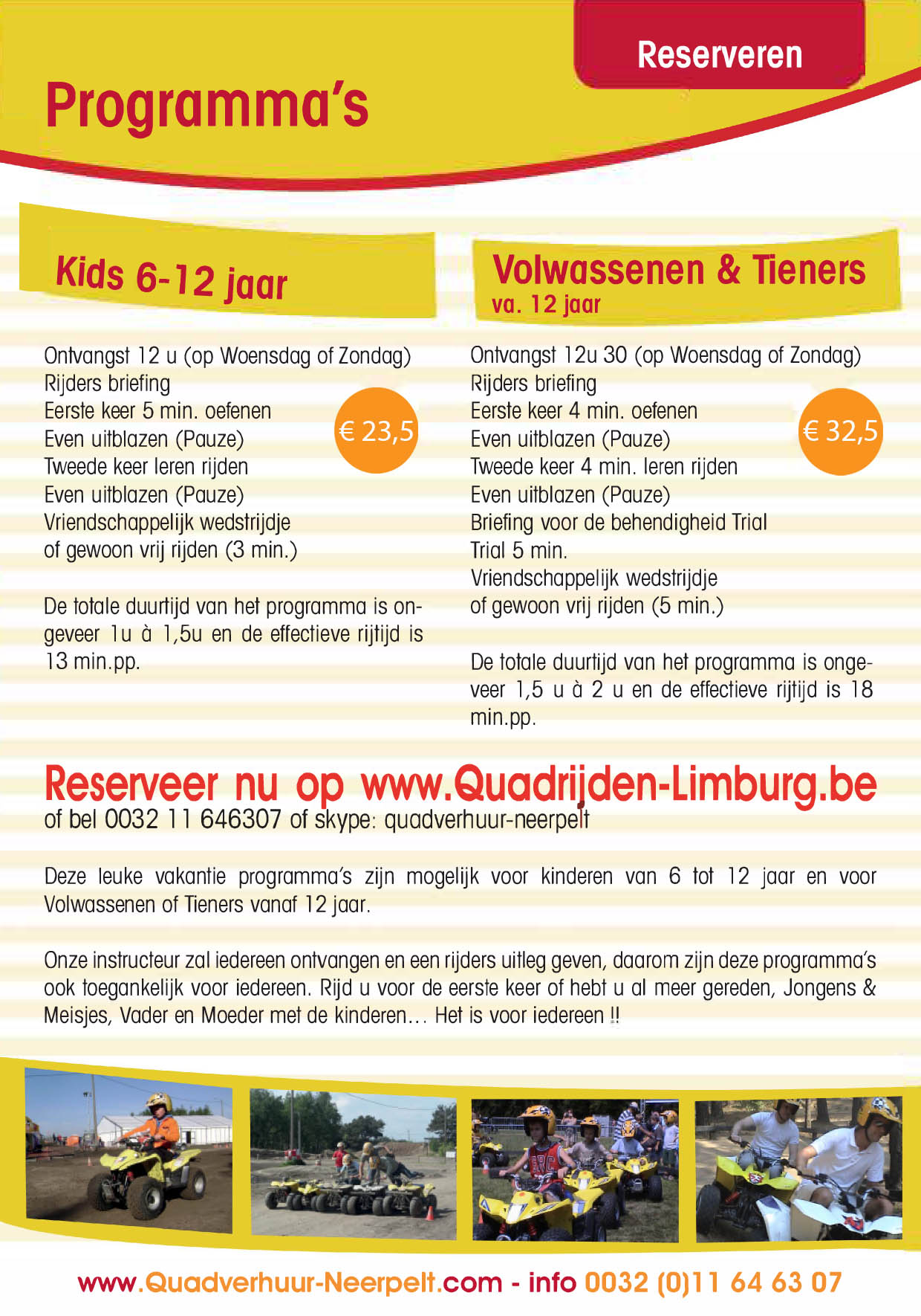 Voor Kids van 6 tot 12 jaar 50cc Quads, en de Volwassenen en Tieners vanaf 12 jaar 90cc sport Quads.